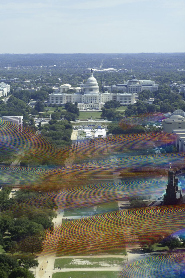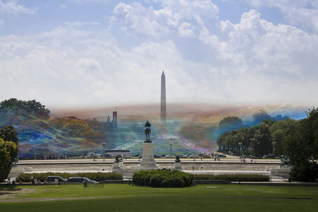 A wifi impulzusok itt színes gömbökként láthatóak. A wifi adók alapvetően egy átviteli protokollal ellátott antenna, amely különböző frekvenciasávban osztja szét az adatokat. A különböző színek képviselik az elektromágneses spektrumot, az általunk használt vörös, narancs, sárga, stb., hogy bemutassák a láthatatlan wifi csatornákat.
